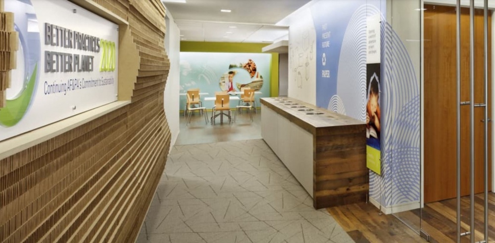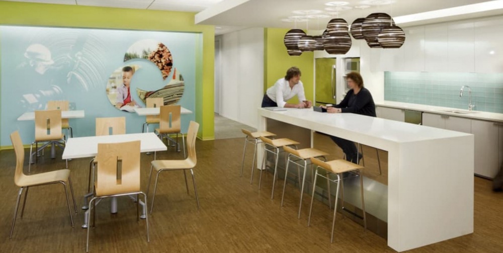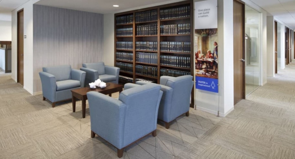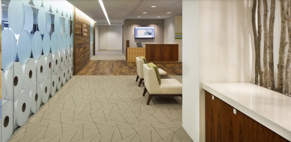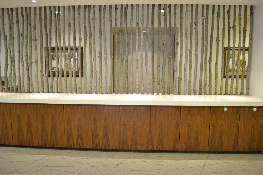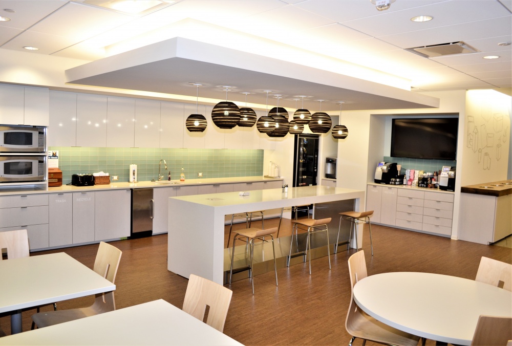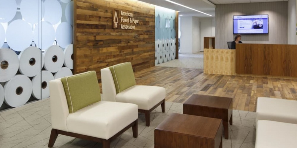 When you enter the headquarters of American Forest & Paper Association you are immediately embraced by a unique collection of materials which showcase the design by Fox Architects in collaboration with HITT Contracting and Gaithersburg Architectural Millwork. The Association advocates for the wood products manufacturing industry which is evident throughout the project. Looking around, you see several areas of reclaimed hardwood flooring from local Virginia barns. This reclaimed wood is strategically placed throughout the space in the elevator lobby, feature walls and on countertops. Graphics and signage were used throughout the space to display and highlight the different product uses and features of wood product manufacturing. Corrugated cardboard is used as a design element throughout the space, showcased in areas such as the lighting shades in the café. Responsible forestry is key for future generations and recycling wood products as seen at the American Forest & Paper Association headquarters is their way of contributing to those endeavors. This project was a recipient of the WBC Craftsmanship Award.